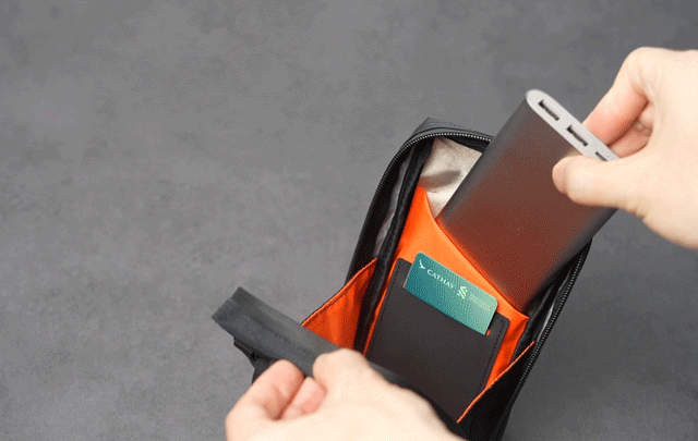 例えば、スマホ、財布、モバイルバッテリー、イヤホン、パスポート、ケーブル、カード、ペン、鍵など、必要なアイテムをしっかり収納可能。