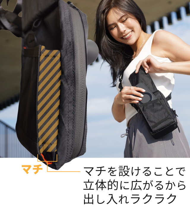 フロントポケットはマチ付き設計で、スマホやパスポートなどをゆったりと収納できます。