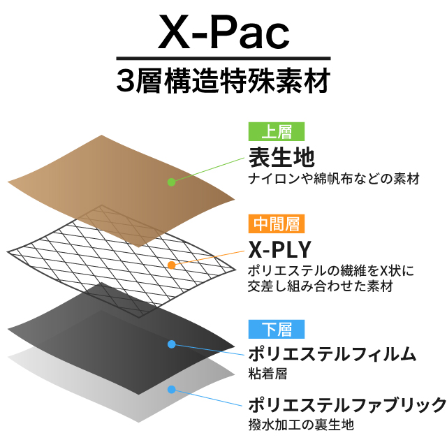 X-Pacとは、ヨットの帆から生まれた、特殊な3層構造を持つ素材です。