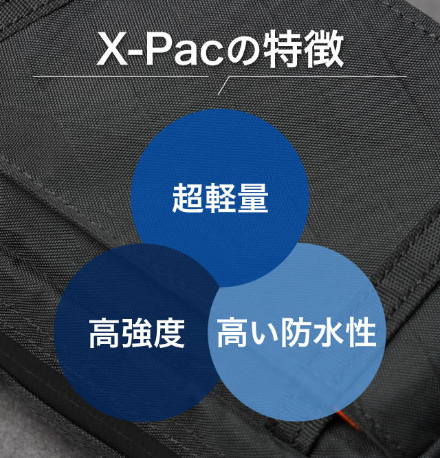 軽量かつ高い強度を備えたX-Pac素材を採用し、普段使いからアウトドアまで幅広く活躍します。