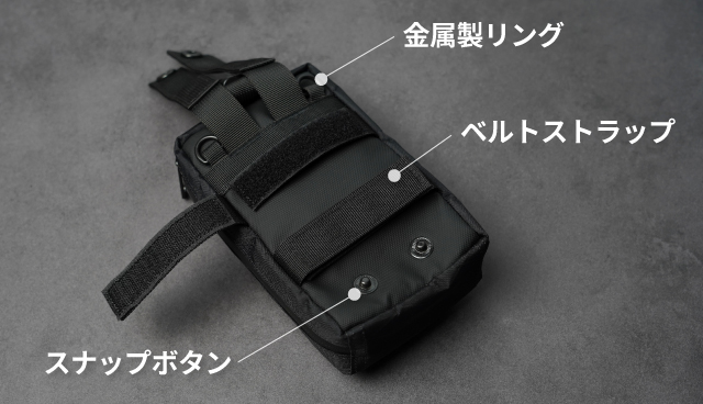 他のバッグやベルトに取り付けられるモジュラーシステムを採用。